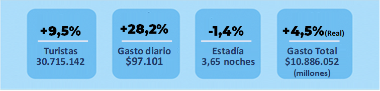 l La cantidad de personas que viajaron en toda la temporada creció 9,5% frente a la temporada 2025, mientras que el gasto total real aumentó 4,5%, impulsado específicamente por la mayor cantidad de personas que pernoctaron al menos una noche fuera de su ciudad.