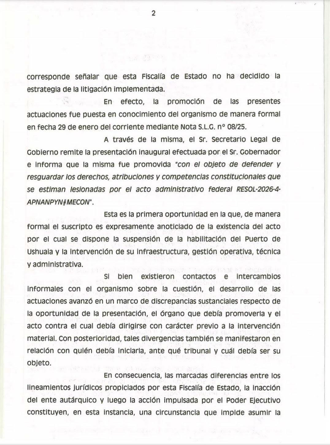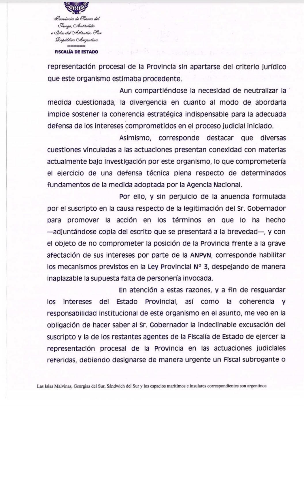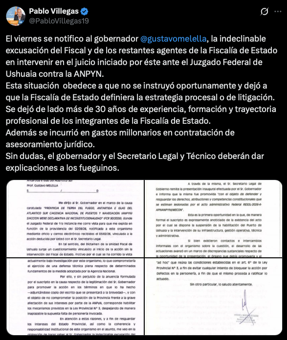 Según informó Villegas, el pasado viernes el gobernador Gustavo Melella fue notificado de la indeclinable excusación del Fiscal de Estado y de los restantes agentes de la Fiscalía de Estado para intervenir en el juicio iniciado ante el Juzgado Federal de Ushuaia contra la ANPYN.