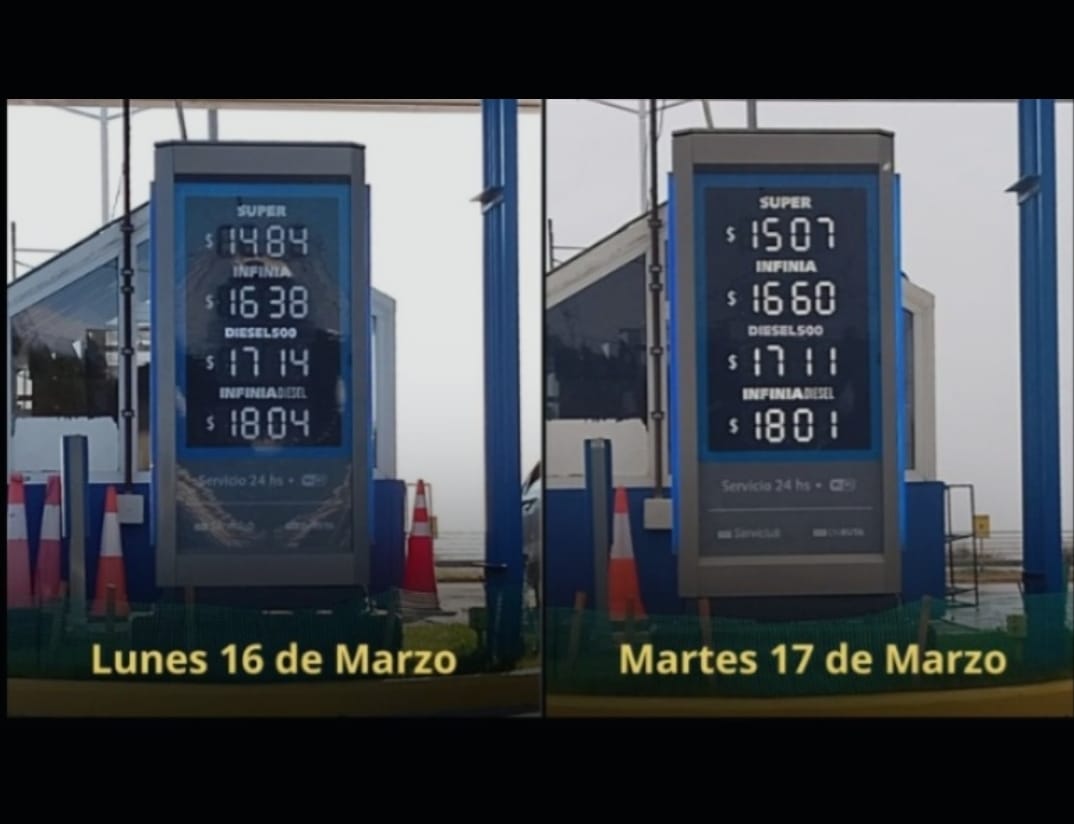 Rio Grande 17/03/2026.- Ya ni siquiera se informa como aumenta ni cuanto los combustibles en nuestra provincia, entre el lunes y el martes de esta semana aumentó 23 pesos, y acumula mas de un 300 % 128 pesos en 16 dias de marzo.