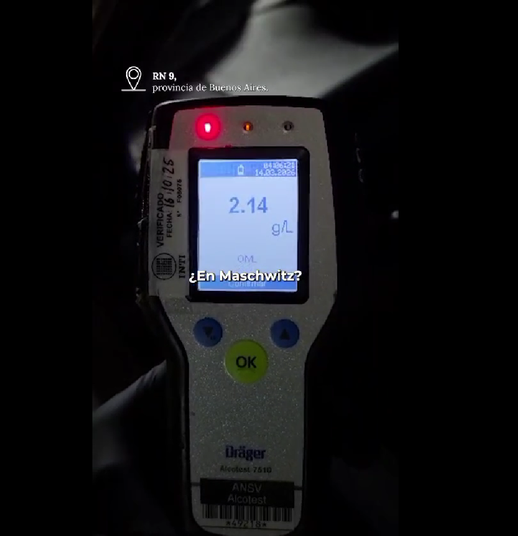 La otra alcoholemia positiva máxima se registró en Bahía Blanca, mientras que el test de 2,14 g/l ocurrió sobre la Ruta Nacional 9, donde el conductor minimizó la situación al decir que venía de “tomar una copa” en la casa de un amigo.