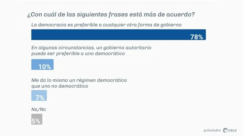 La encuesta también midió las percepciones sobre el sistema político. En ese sentido, el 78% de los consultados afirmó que la democracia es preferible a cualquier otra forma de gobierno, mientras que solo un 10% consideró que, en determinadas circunstancias, un gobierno autoritario podría ser preferible.