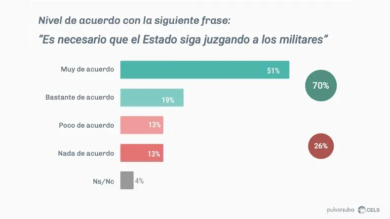 El 70% de los encuestados se manifestó “muy de acuerdo” o “bastante de acuerdo” con que el Estado continúe juzgando a los militares por delitos de lesa humanidad.