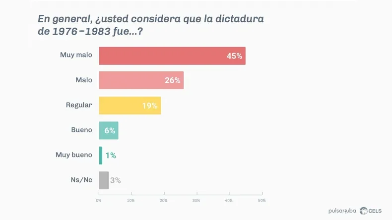 A casi 50 años del golpe de Estado del 24 de marzo de 1976, una investigación del observatorio Pulsar de la Universidad de Buenos Aires (UBA) y el Centro de Estudios Legales y Sociales (CELS) revela que una amplia mayoría de la sociedad argentina mantiene una valoración negativa del último gobierno militar.