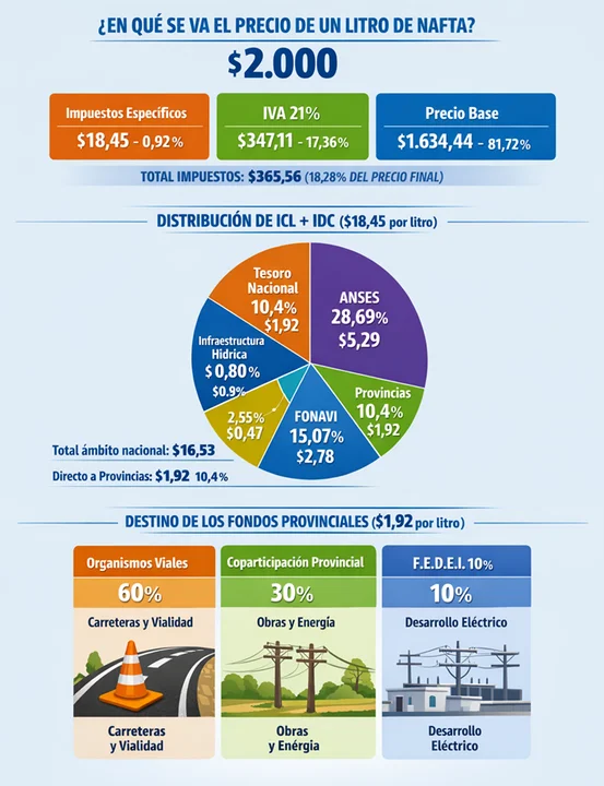 Esos $ 18,45 por litro se derivan entre $ 16,53 que va a la Nación y $ 1,92 a las provincias.