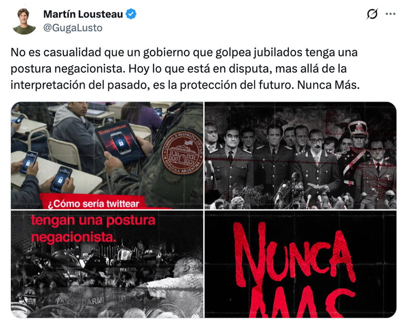 Sus historias, como las de todas las víctimas, merecen escucha y comprensión. Lo que no merece nada de eso es el mensaje de un Gobierno que, si se presta atención, comenzó en 2023 con la reivindicación de las aberraciones sistemáticas cometidas por las Fuerzas Armadas en el marco de una supuesta «guerra» que no fue tal cosa, sino una represión ilegal que no respetó ningún «derecho de guerra» de los militantes de las organizaciones armadas y políticas, imponiéndoles una pena de muerte ilegal y sumaria, que se cebó finalmente contra toda una sociedad, que persiguió cualquier forma de acción colectiva y de disenso, y que sometió a toda una generación, en diversos grados pero sin dejar indemne a nadie, a conculación de la democracia, empobrecimiento, represión, censura, tortura, servidumbre, apropiación de niños, violación, desaparición y asesinato.