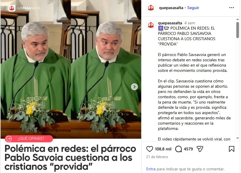 En el clip, Savsavoia cuestiona cómo algunas personas se oponen al aborto, pero no defienden la vida en otros contextos, como, por ejemplo, frente a la pena de muerte. “Si uno realmente defiende la vida y es provida, significa protegerla en todos sus aspectos”, afirmó el sacerdote, generando miles de comentarios y reacciones en la plataforma.