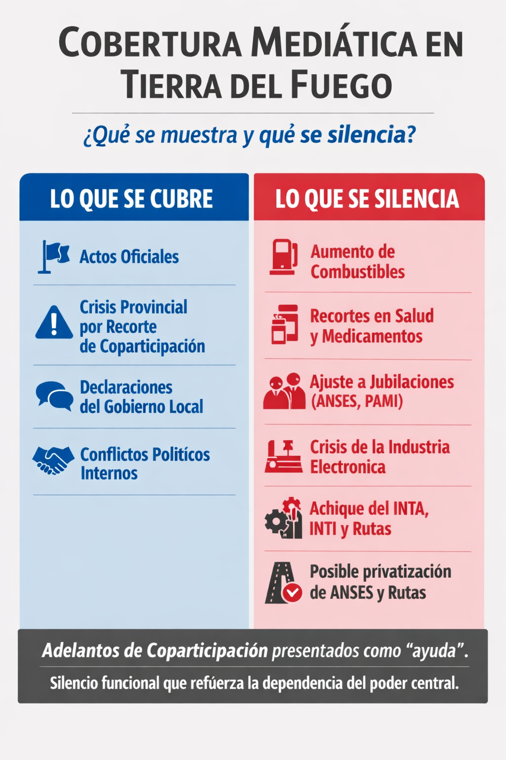 La selección de temas no es neutral. Al invisibilizar los ajustes nacionales —medicamentos, jubilaciones, industria electrónica, mantenimiento de rutas, achique de organismos técnicos— y amplificar las tensiones provinciales, los medios construyen un relato donde la responsabilidad parece recaer exclusivamente en la gestión local.