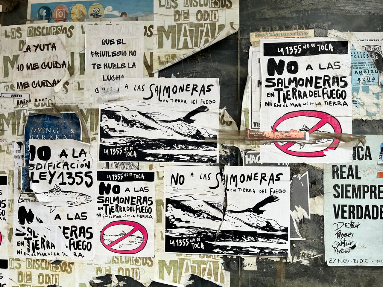 En la ciudad de Ushuaia es cada vez más común encontrarse con proclamas en contra de la salmonicultura en el mar. Durante el 2025, mientras se debatía modificar la Ley 1355, muchos locales colocaron en sus vidrieras el “No a las salmoneras” especialmente en espacios de circulación turística y zonas costeras.