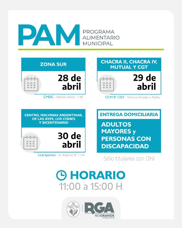 Rio Grande 28/04/2026.- El Municipio de Río Grande recuerda a los vecinos y vecinas que este martes 28 de abril comienza la distribución de los módulos alimentarios en diferentes puntos de la ciudad, destinada a quienes están empadronados en el Programa Alimentario Municipal.