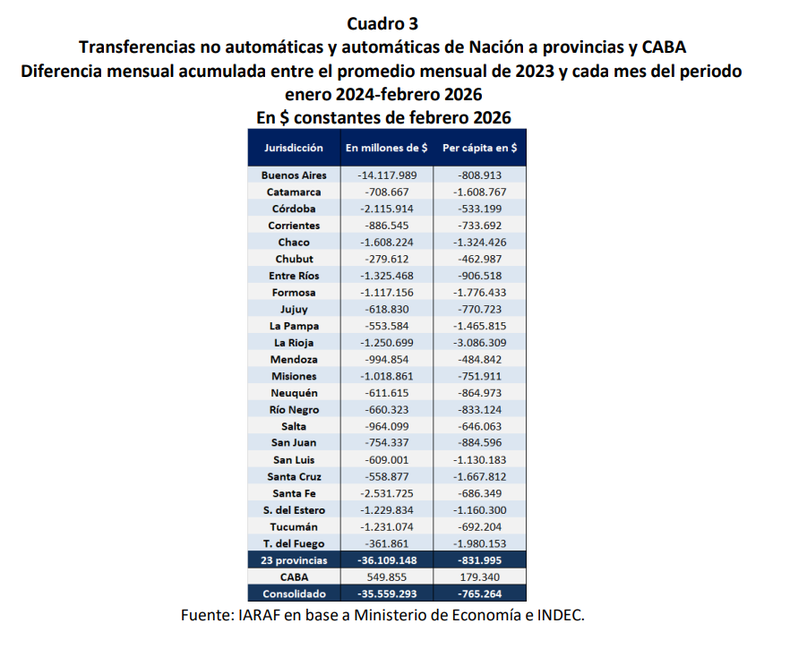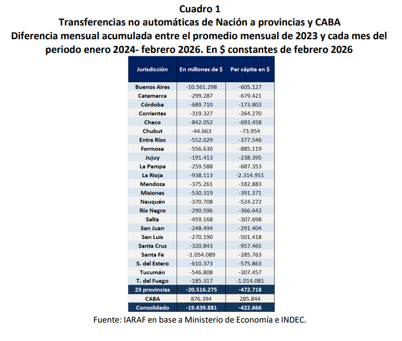 El informe del Instituto Argentino de Análisis Fiscal (IARAF) explicó que la reducción respondió tanto a decisiones discrecionales del Gobierno, en el caso de las transferencias no automáticas, como a la caída en la recaudación de impuestos coparticipables, que afectó los envíos automáticos.