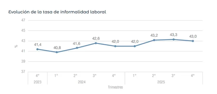 La informalidad laboral alcanzó el 43% en el cuarto trimestre de 2025, según datos del INDEC, lo que implica que millones de trabajadores en Argentina no cuentan con obra social ni aportes jubilatorios. El indicador subió un punto porcentual respecto al mismo período de 2024, en un contexto de creciente deterioro del mercado laboral.