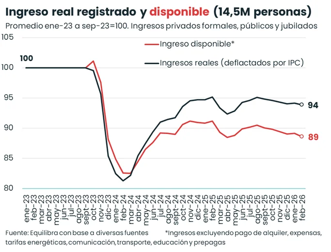 En paralelo, el ingreso disponible —lo que queda tras pagar gastos básicos— cayó 0,6% en febrero y se ubicó 11% por debajo del promedio previo al cambio de gobierno, según la consultora Equilibra.