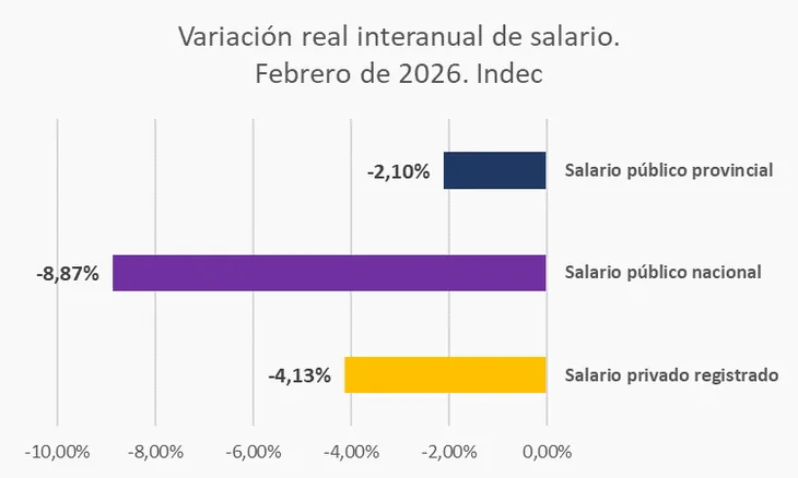 El deterioro salarial pega con más fuerza en los extremos del mercado laboral. En el caso del sector público nacional, el aumento mensual fue de apenas 0,6% en febrero, muy lejos del 2,9% de inflación. A nivel provincial, los salarios empataron con los precios, pero no lograron recuperar terreno.
