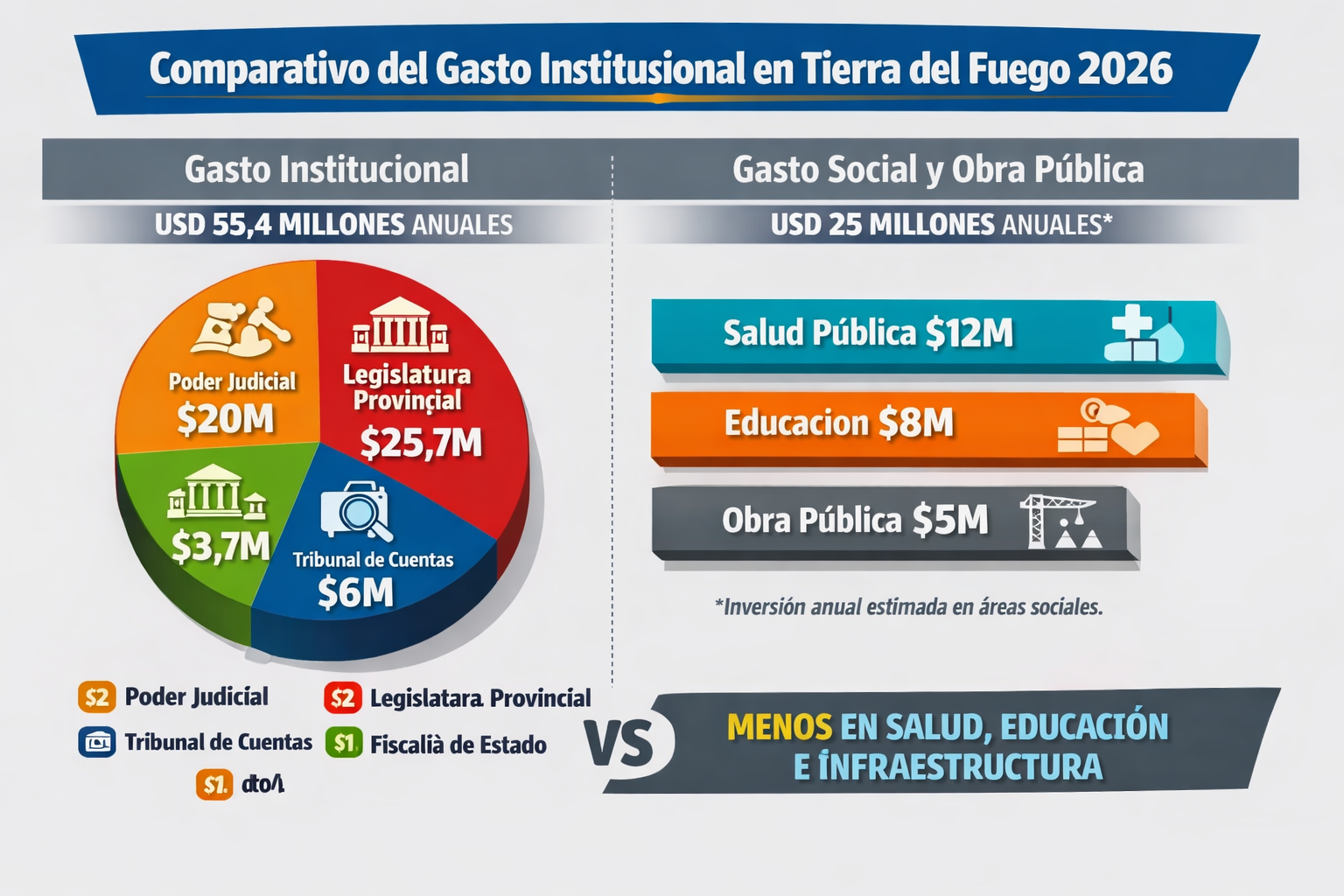 - Desbalance funcional: el costo conjunto de estos cuatro organismos equivale a casi el doble del presupuesto anual de salud pública y supera ampliamente el gasto en infraestructura social.