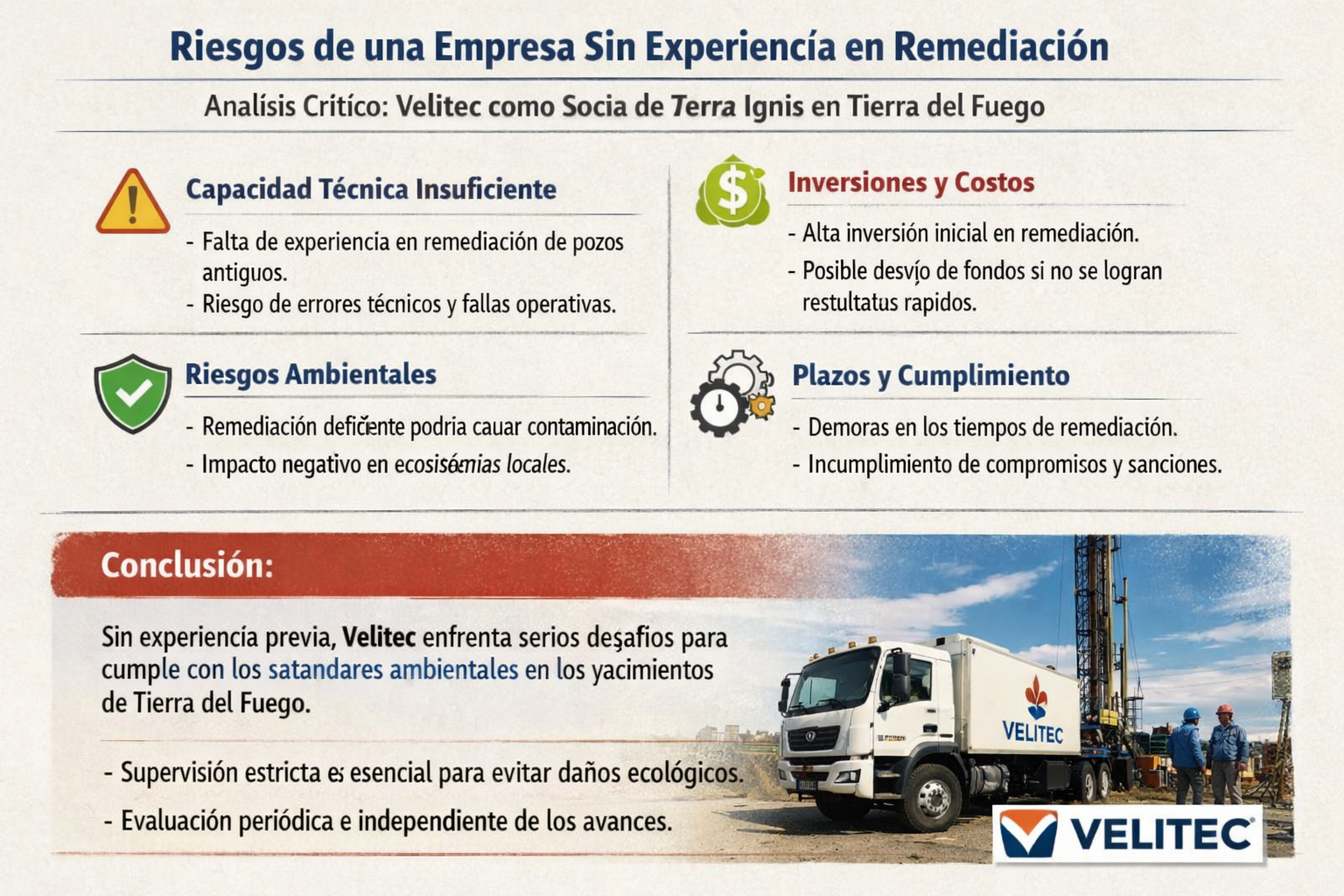 Exacto: la síntesis es que Velitec no tiene antecedentes comprobados en remediación de pozos antiguos. Su perfil está más ligado a perforación, operación de plantas compresoras de gas y proyectos de infraestructura energética y telecomunicaciones.