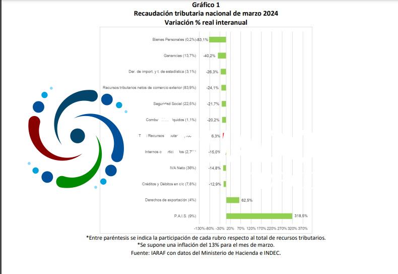 En términos de variación interanual real en estos tres meses, los tributos con mayor caída habrían sido Bienes Personales (68,4%), Combustibles (50%) y Ganancias (38,9%). Los tributos con mayor aumento habrían sido impuesto PAIS (303,5%), derechos de exportación (109,7%) y derechos de importación (6,5%).